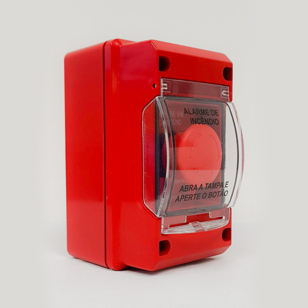 Acionador manual IP 55 / IP 67 sobrepor - Endereçável Dispositivo de atuação manual, tipo abra a tampa e aperte o botão (tipo soco), em Sistemas de Detecção e Alarme de Incêndios. Desenhado para instalações do tipo ao tempo - IP 55 / IP 67, em ambientes não classificados. Possui indicador de supervisão através de LED verde. Possui indicador de dispositivo atuado, através de LED vermelho, o qual é ativado pelo painel de alarme.